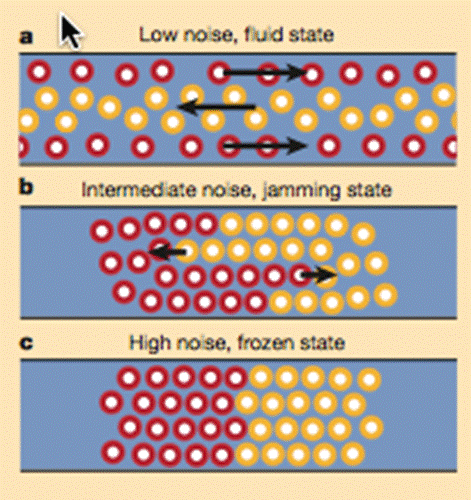 An intermediate noise level causes an increase of irregular behaviors (in other terms, unpredictable human behavior) and shows the presence of serious problems that are experienced regarding the relationships among people. The corresponding situation for this case is shown on Figure 1b. Here, the pedestrian traffic is now jammed and the flow is almost halted. It is impossible for lanes to form since irregular behaviors are above a certain critical level. For a system to be rescued out of this state, oscillations of sufficient magnitude are necessary.